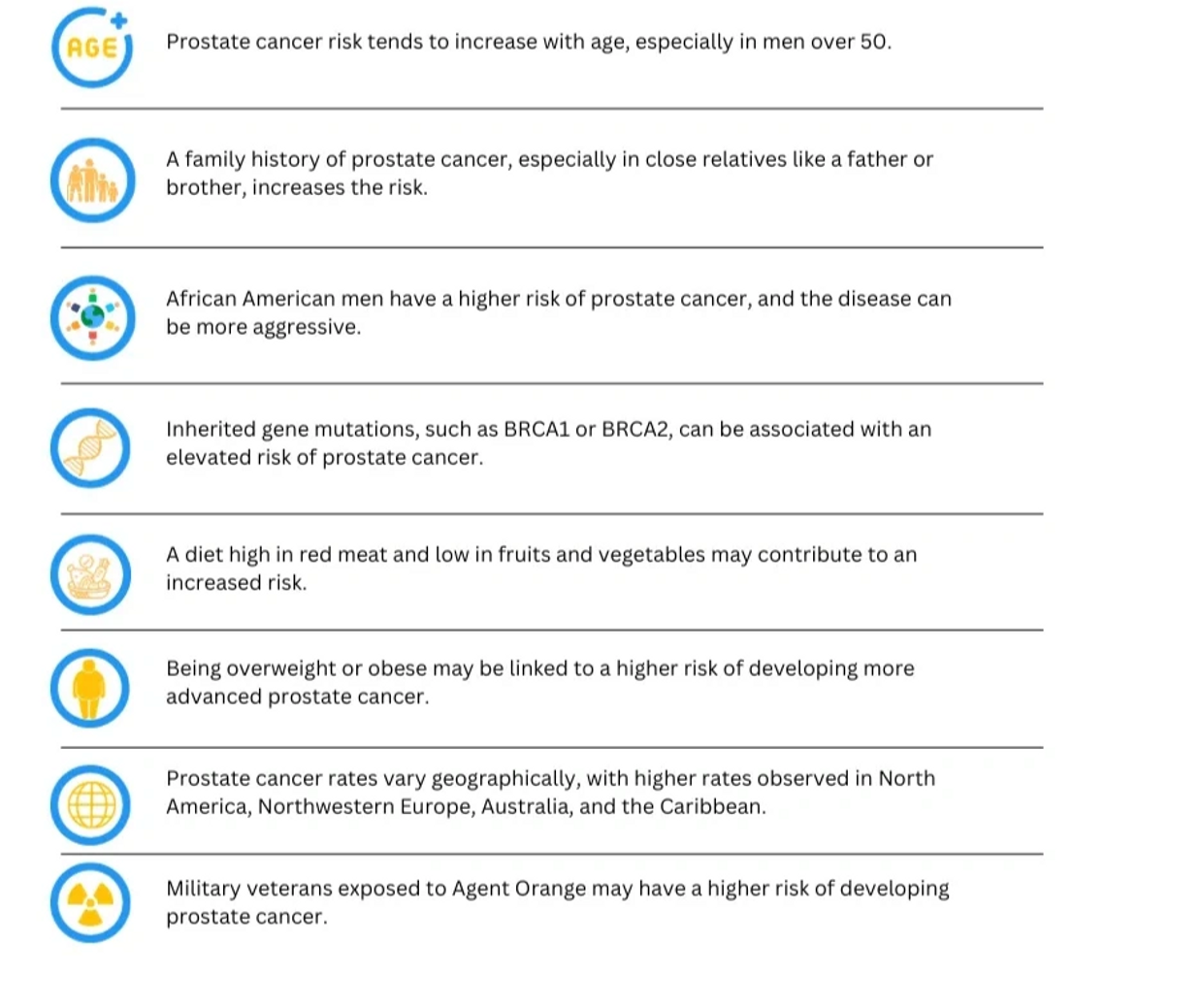 Several factors can contribute to an increased risk of developing prostate cancer. It's important to note that having these risk factors doesn't guarantee the development of prostate cancer, but they may increase the chances. Common risk factors include: